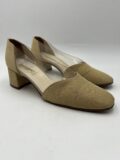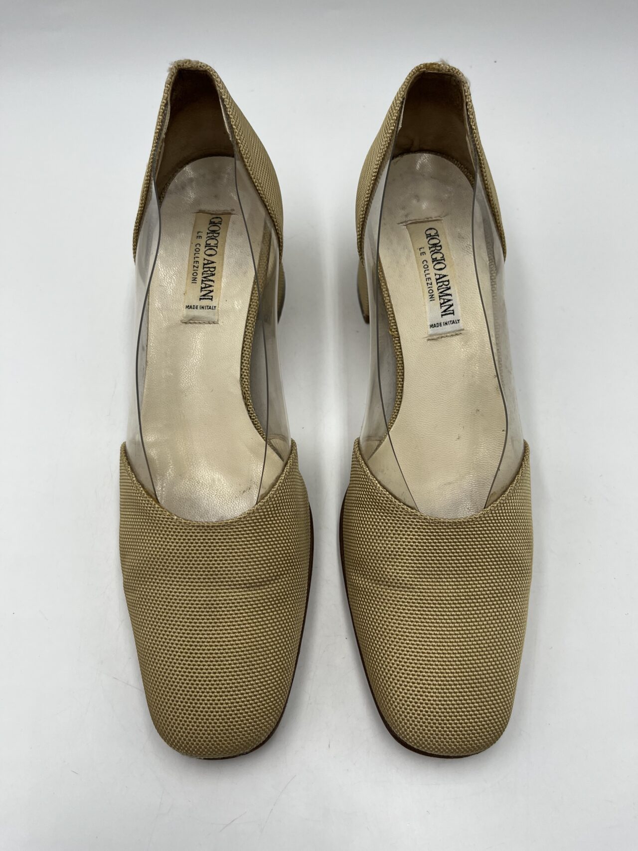Escarpins vintage Giorgio Armani bi-matière en toile beige et plastique transparent sur les côtés. Pointure 37. Très bon état.
