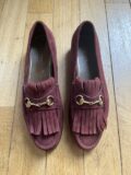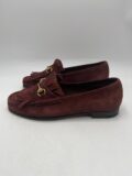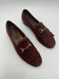 Mocassins Gucci en daim marron à plaques métalliques dorées. Pointure 40. Très bon état.